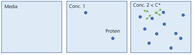 At very low concentrations (Conc. 1), protein molecules are far apart from each other and thus interaction between molecules is negligible. With no interaction between molecules, viscosity increases proportionally with concentration. As the concentration is increased, as seen in the third drawing (Conc. 2), protein molecules start interacting with each other.
