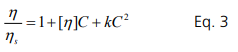Note that higher order terms are not included. As the concentration is increased further, tertiary or higher order interactions become dominant. Therefore, Eq. 3 is only valid at low concentrations. The maximum valid concentration (C*) for application is discussed in the last section. The equation is rearranged to become the Huggins’s equation. It is important to note that [η]C scales with the volume fraction.