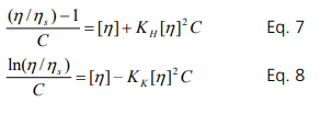 KH is the Huggins’s constant, ηs is the solvent viscosity and ηr is the relative viscosity. Alternatively, the Kraemer equation has been also used for the intrinsic viscosity measurement.