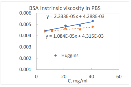 An order of magnitude estimation of the intrinsic viscosity can be estimated from the molecular weight of protein using Eq. 2. Then the maximum concentration can be estimated from Eq. 3 with the constraint that viscosity increase over solvent, [η]C, is less than 20% or 0.2. Please note that [η]C scales with the volume fraction of the protein molecules in the media. After the intrinsic viscosity measurement is obtained, one can do a sanity check for the maximum concentration by calculating 0.2/[η]. For the BSA solution in PBS, the maximum concentration is calculated to be 0.2/0.0043 = 46 mg/mL. The maximum concentration suggests that concentration ranges were properly selected for the intrinsic viscosity measurement shown in the graph.
